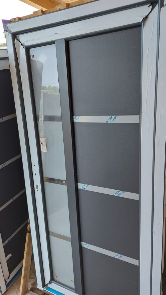 Nové, jednokrídlové, ľavé, plastové vchodové dvere, ktoré sú presklené, s rozmermi š100 cm a v205 cm, zvonka antracit, zvnútra biele, s hliníkovým prahom, 5 bodovým zamykaním a s 3 kusmi 3D závesmi dverí. V cene produktu je kľučka, zámok s 5x kľúčmi. Okná sú zasklené izolačným dvojsklom .